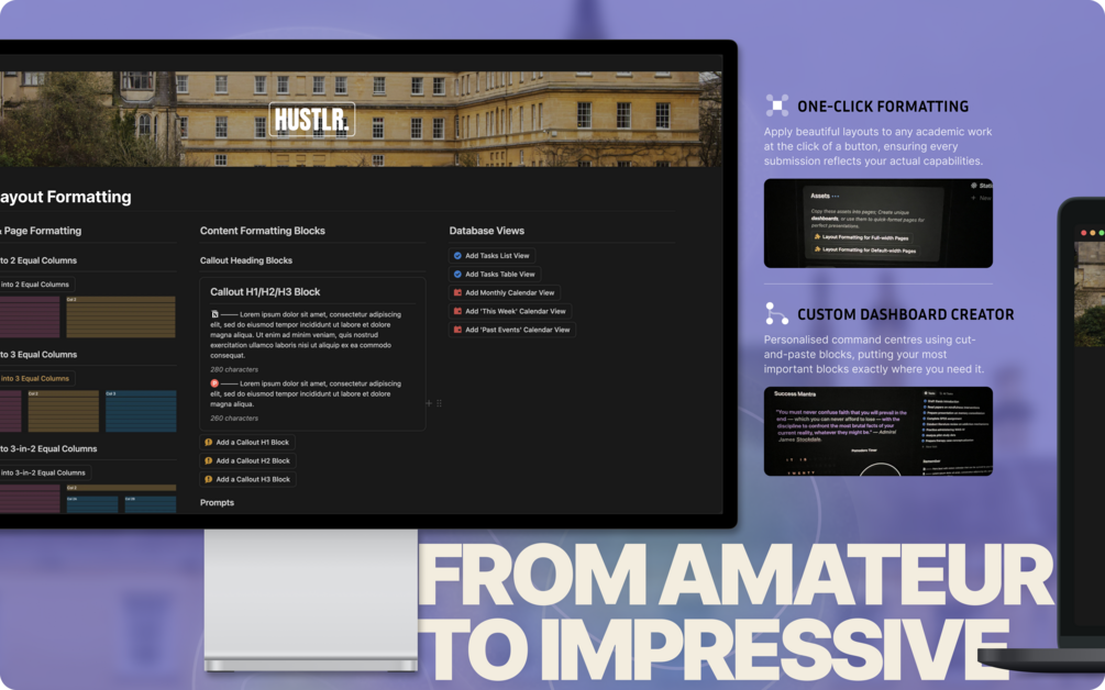 Q: Do I need Notion experience to use AcademiX effectively?Ā A: No prior Notion experience required. The template includes comprehensive setup instructions and intuitive navigation that gets you organized in 15 minutes. Most students find it more user-friendly than traditional planning apps because it's designed specifically for academic workflows.