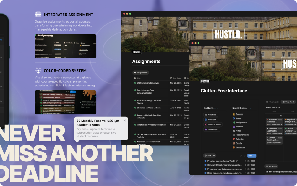Q: How does this compare to expensive academic planning subscriptions?Ā A: AcademiX is a one-time purchase that provides lifetime access to comprehensive academic organization. Unlike subscription services costing $20+ monthly, you own this system forever with no recurring fees, saving hundreds of dollars over your academic career.