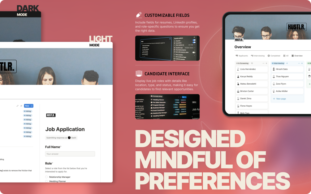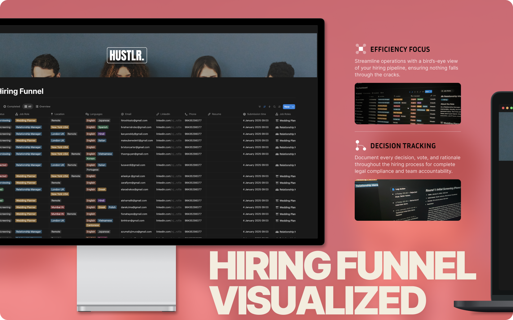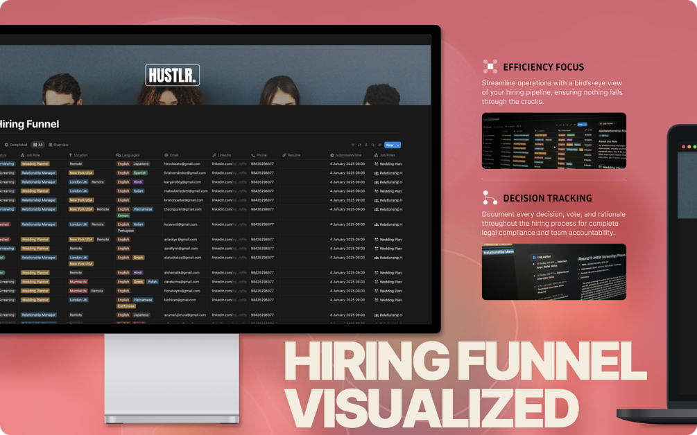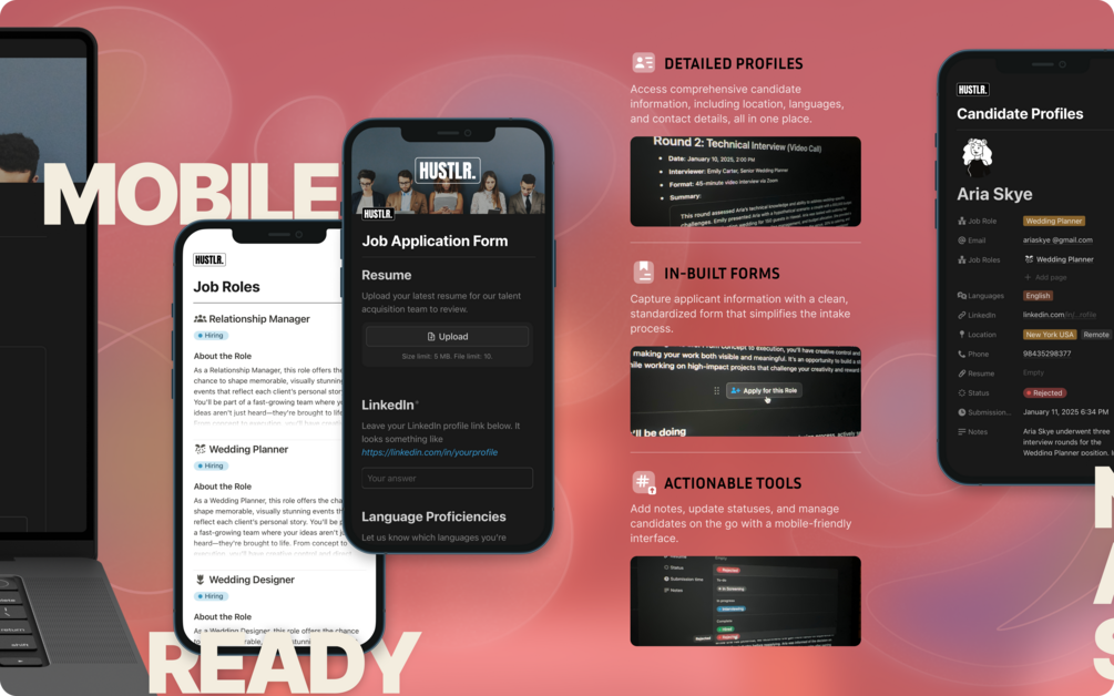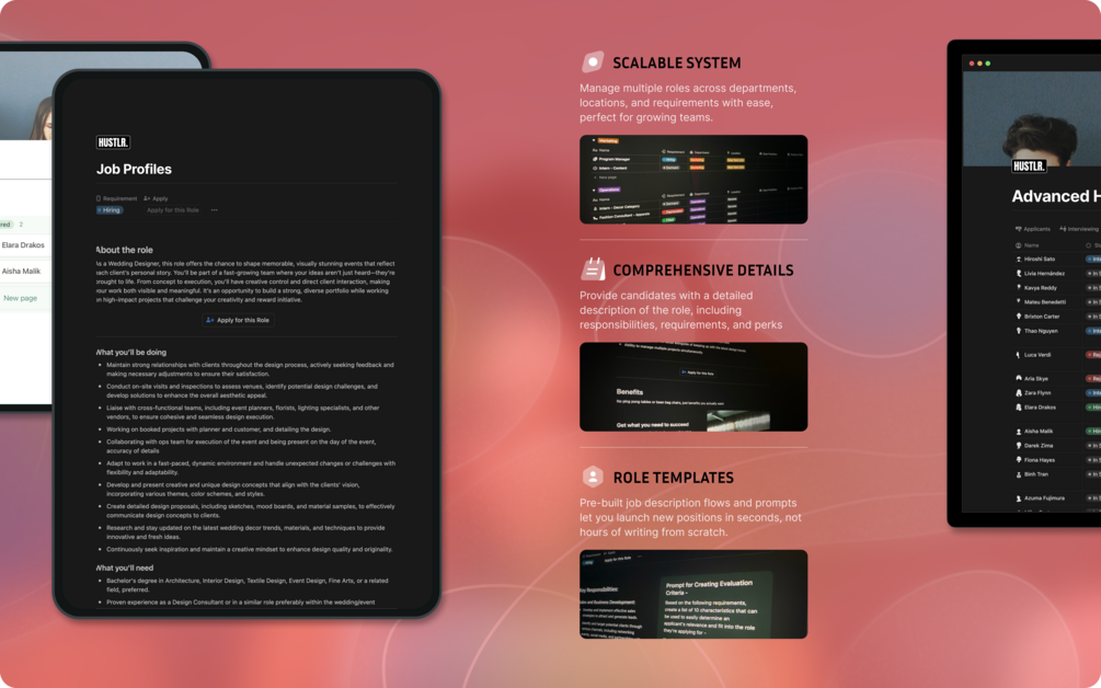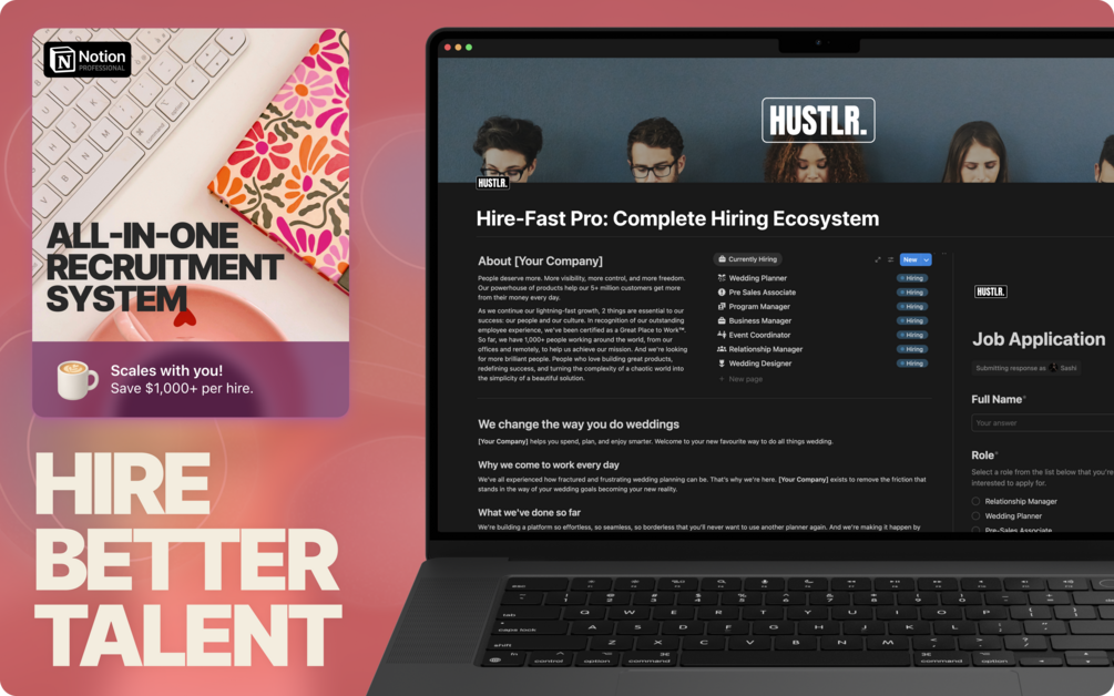You get access to detailed documentation, video tutorials, and email support to help you make the most of your hiring system - You can reach out to us at support@hustlr.pro. We also regularly update the template based on user feedback and Notion's new features. -