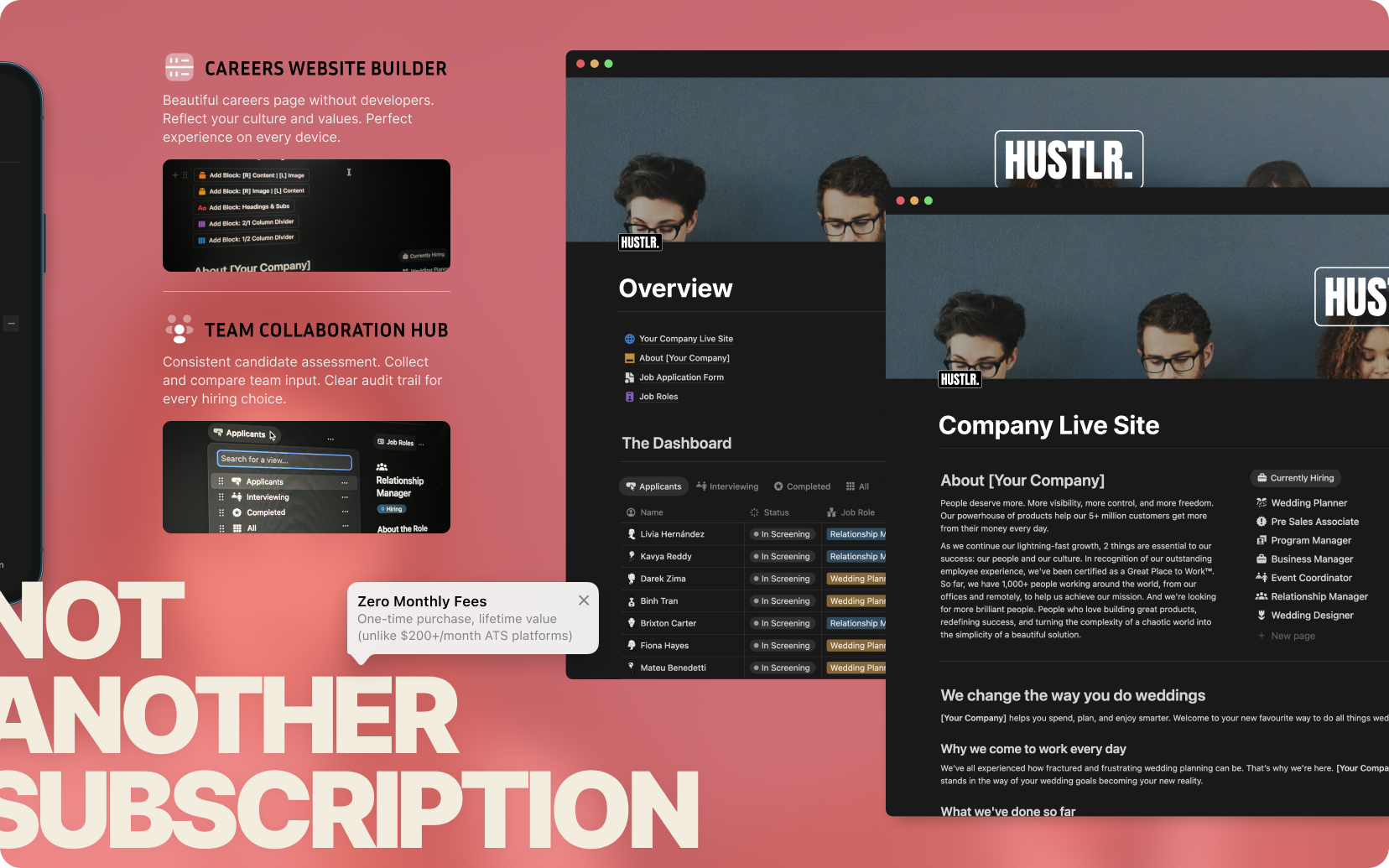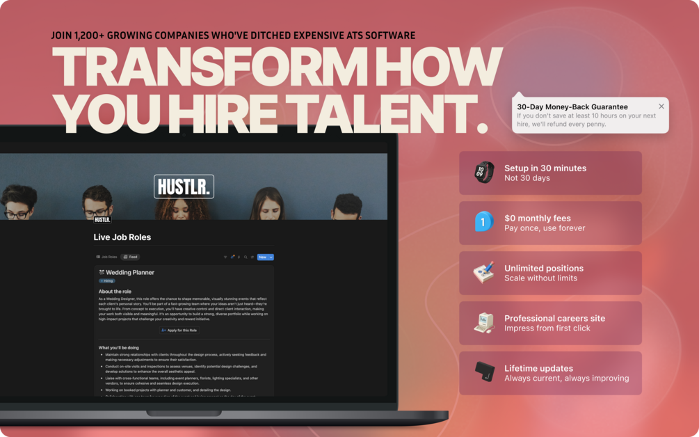 The ultimate all-in-one recruitment command centre that transforms Notion into your complete hiring ecosystem. Combine a professional careers website with powerful applicant tracking—no coding required.