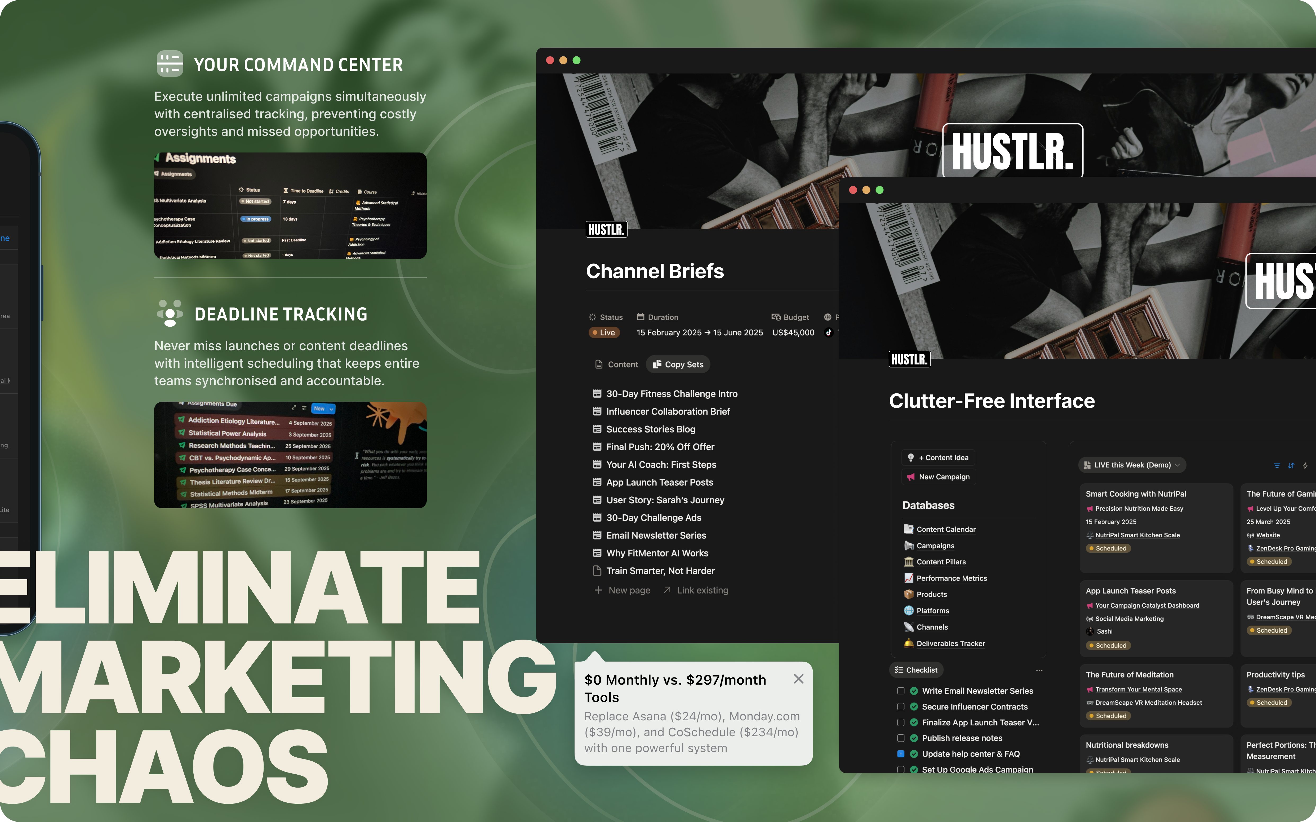 ⚡ The Solution: One comprehensive Notion system that replaces $297+/month in subscriptions while giving you complete control over unlimited campaigns from a single dashboard.