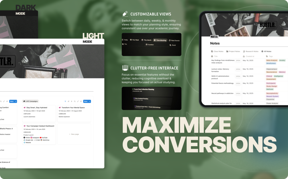 Transform content chaos into a well-orchestrated symphony. This comprehensive planning system helps you map out day-by-day content across all platforms, ensuring consistent messaging that resonates with your audience. No more last-minute scrambling for social media posts or forgetting to promote your latest blog article – everything is planned, scheduled, and ready to drive engagement.
