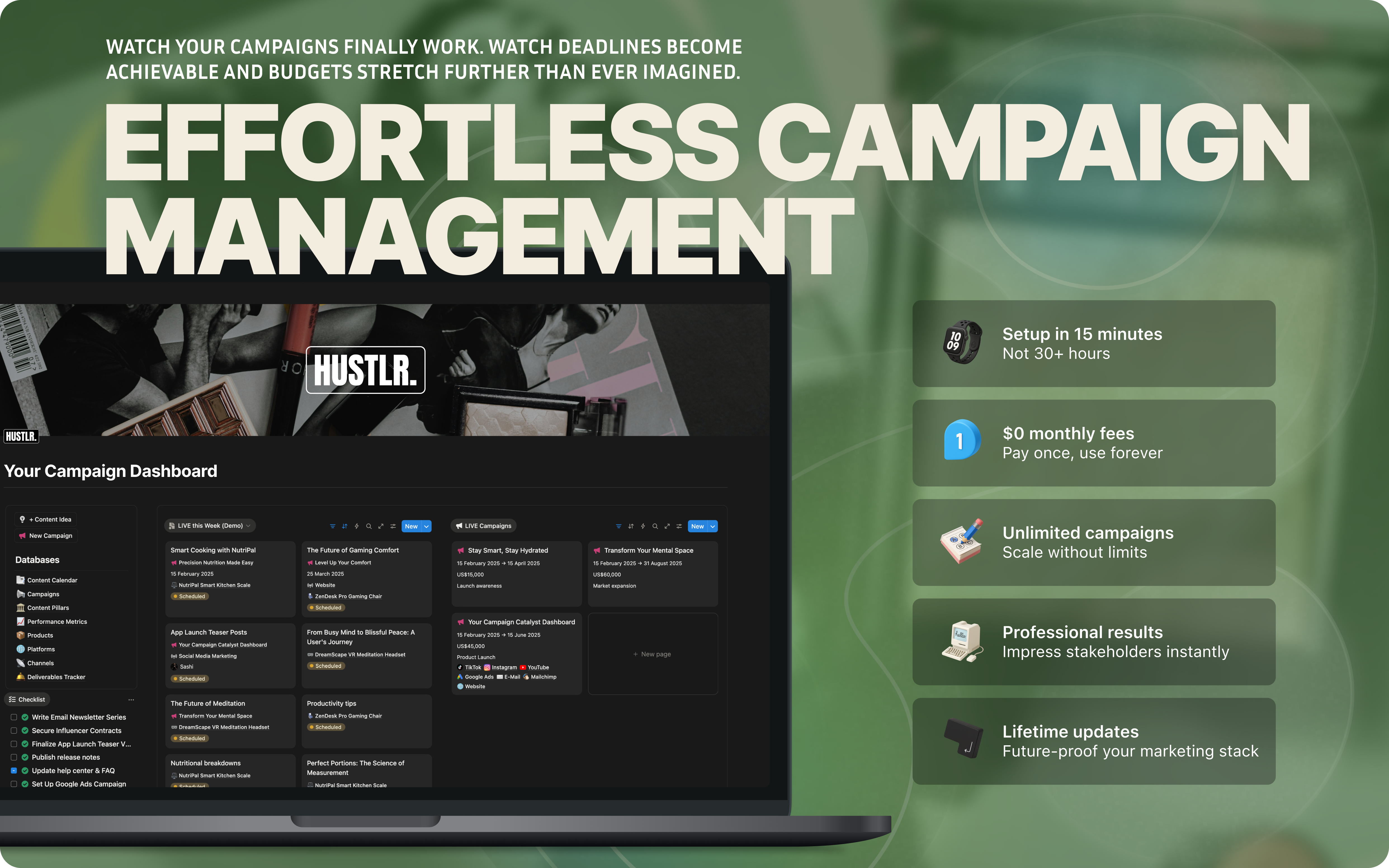 💰 The Numbers: Save 15+ hours weekly, increase campaign success rates by 60%, launch 3x more campaigns without additional stress, and never miss another deadline.
